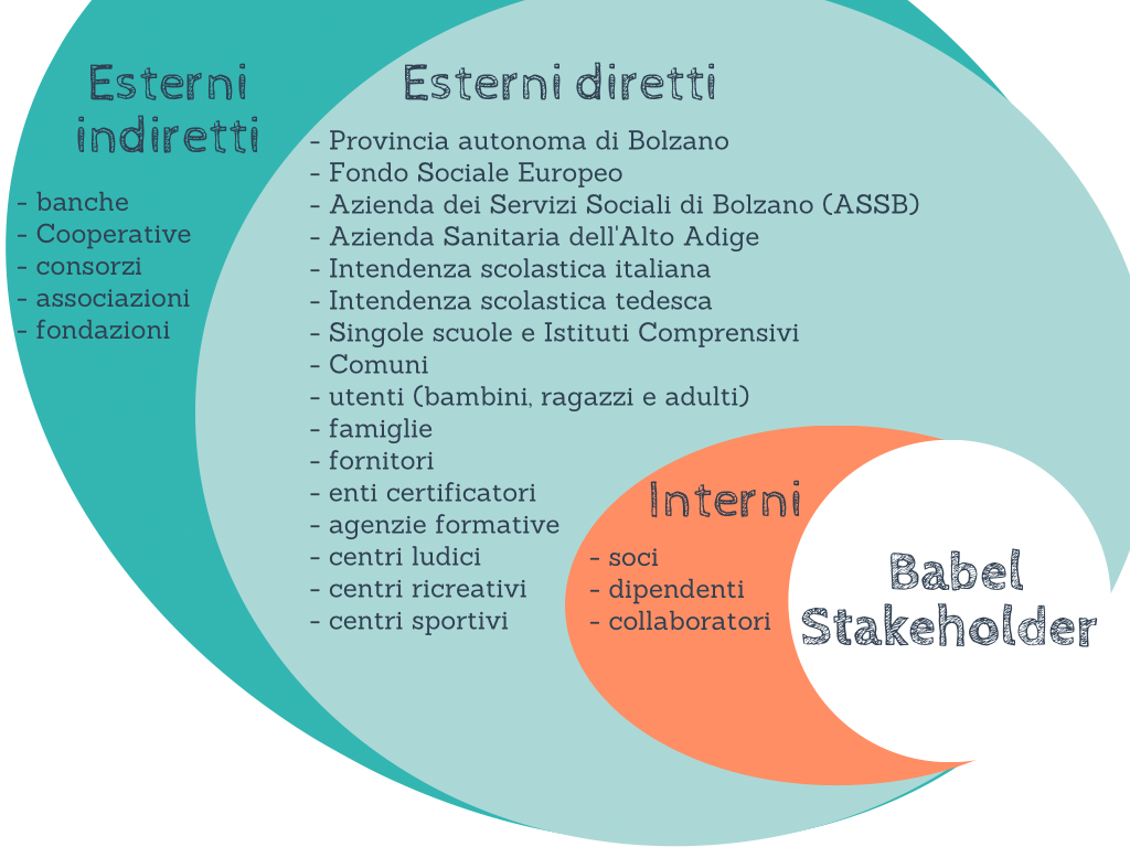 Babel bedient sich des im Laufe der Jahre aufgebauten, sehr großen und gut durchdachten Netzwerks an Beziehungen, das auf der Zusammenarbeit mit dem öffentlichen und privaten Sektor basiert. Dieses Netzwerk ist grundlegend für den Erhalt der hohen Qualitätsstandards der angebotenen Dienstleistungen. Die in der Genossenschaft vorhandenen Dynamiken zwischenmenschlicher Beziehungen haben es als Ziel, durch die Entwicklung und Realisierung innovativer und nachhaltiger Projekte, einen Mehrwert zu schaffen.